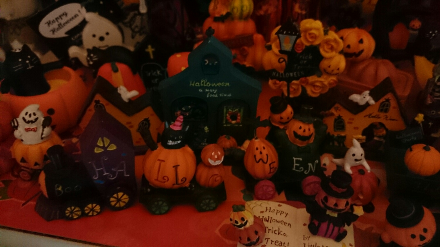 街並みに南瓜めっちゃ並んでるってだけなんですけど、家の形をしているものが3つほどありまして(うち1つは頂き物ですが)それを並べてハロウィントレイン並べてあります。街頭もあって、看板もあるんですがちょっとわかりにくいですねぇ…。