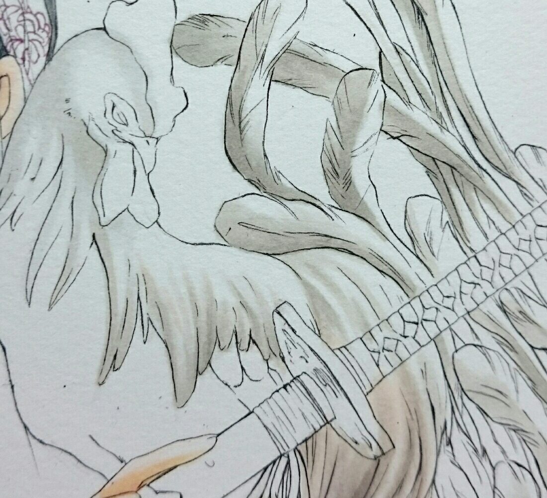 線画。線画綺麗と言っていただいたのですが、個人的には線は安定してないし強弱も微妙だなと…どうもペン先じゃなくてインクの方に問題ありそうな…濃度が増して粘度上昇に付きインクが思うほど伸びなかった印象。インクの濃度って難し過ぎじゃろ…ミリペンに帰りたくなる瞬間ですね