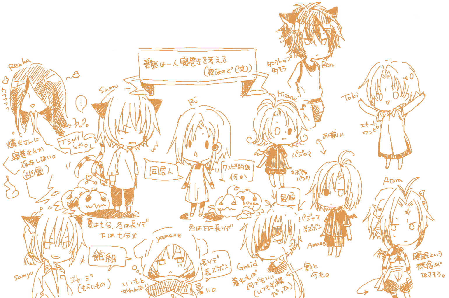 基本は一人でもくもく落書きだったので、一人で寝間着を考えてました。夜なので(笑
