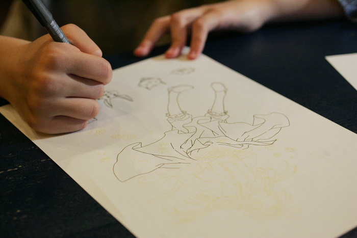 描いたミリペン絵(線を均一にするため)をデジタル処理で黄色くして、それをペン入れしていただくようなものでした。二枚用意したのですがそもそも一枚目だけで60分掛かりましたから(自分でやってみて)二枚目はおまけみたいなものになりました。(おうち帰ってからやってみてね!)