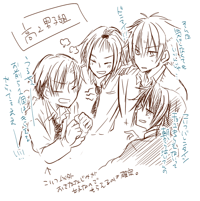 左から伊月、紫苑(千里)、佐山、鬼灯(煉)。セットとしては伊月と煉が仲良くて、千里と佐山が仲が良い。そんで千里と伊月が仲良いから結局ここでグループになってる感じですな!